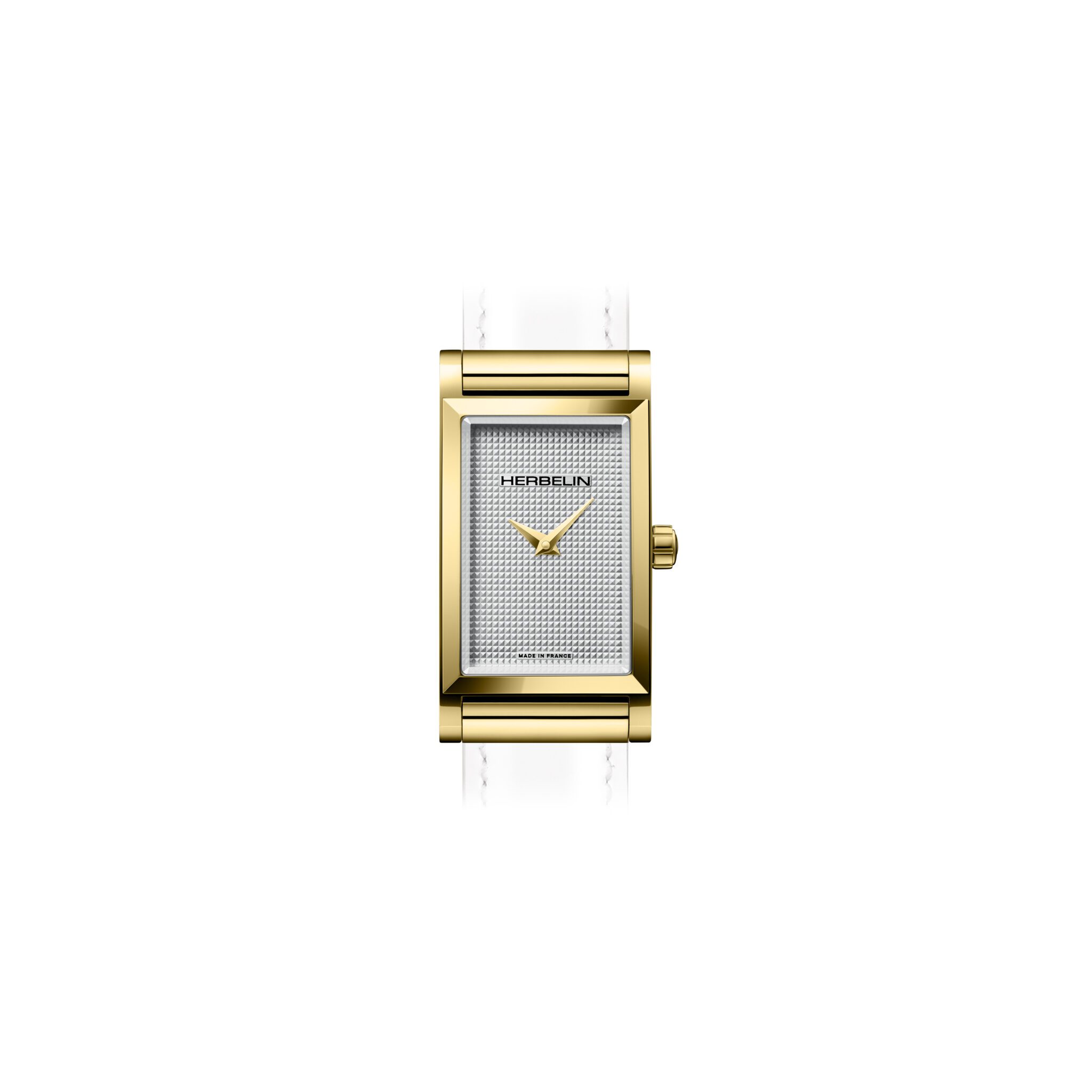 Dieses Modell zeigt ein klassisches und elegantes rechteckiges Gehäuse aus hochwertigem Edelstahl mit gelbgolder PVD Beschichtung und einem facettierten kratzfesten Saphirglas. Darunter präsentiert sich ein silberfarbenes Waffel-Zifferblatt, das gekonnt die Blicke auf sich zieht.