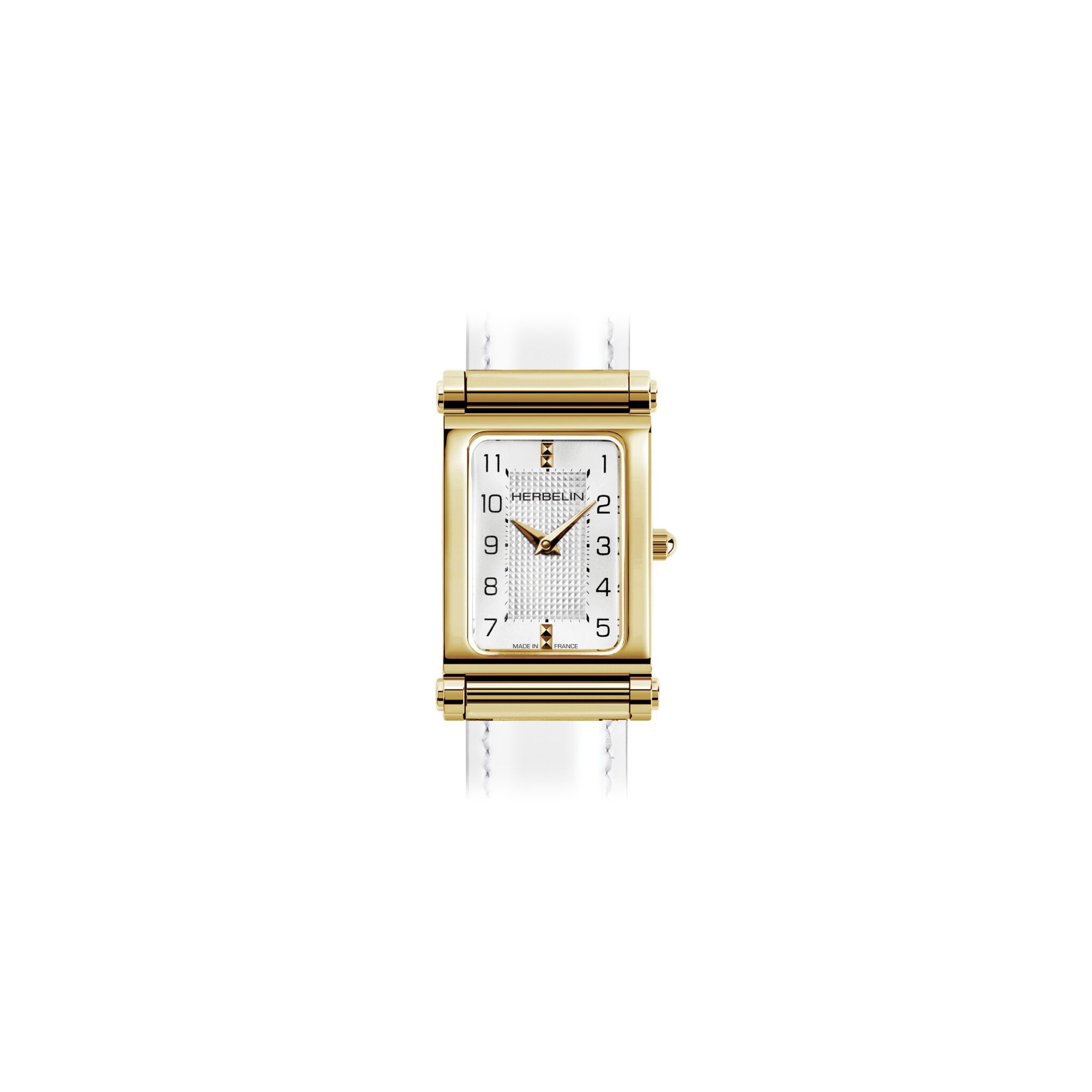 Dieses rechteckige Antarès-Gehäuse ist klassisch elegant und aus hochwertigem Edelstahl 316L mit gelbgoldfarbener PVD Beschichtung gefertigt. Unter dem kratzfesten Saphirglas offenbart sich ein attraktives Zifferblatt mit arabischen Zahlen und einer Guillochierung, das toll aussieht und den Charme dieser femininen Linie wunderbar wiederspiegelt.