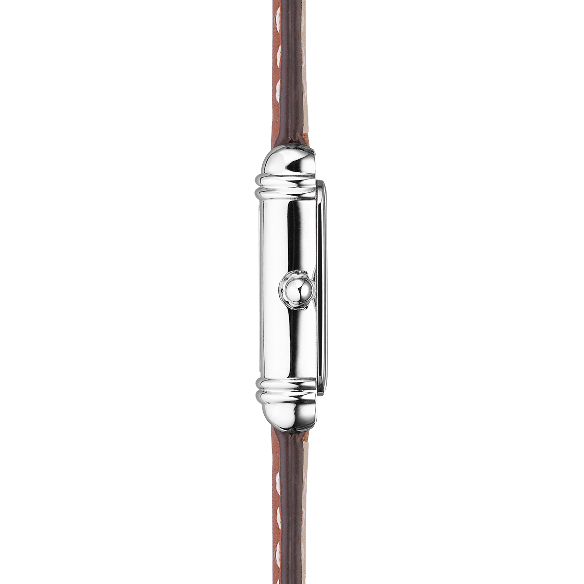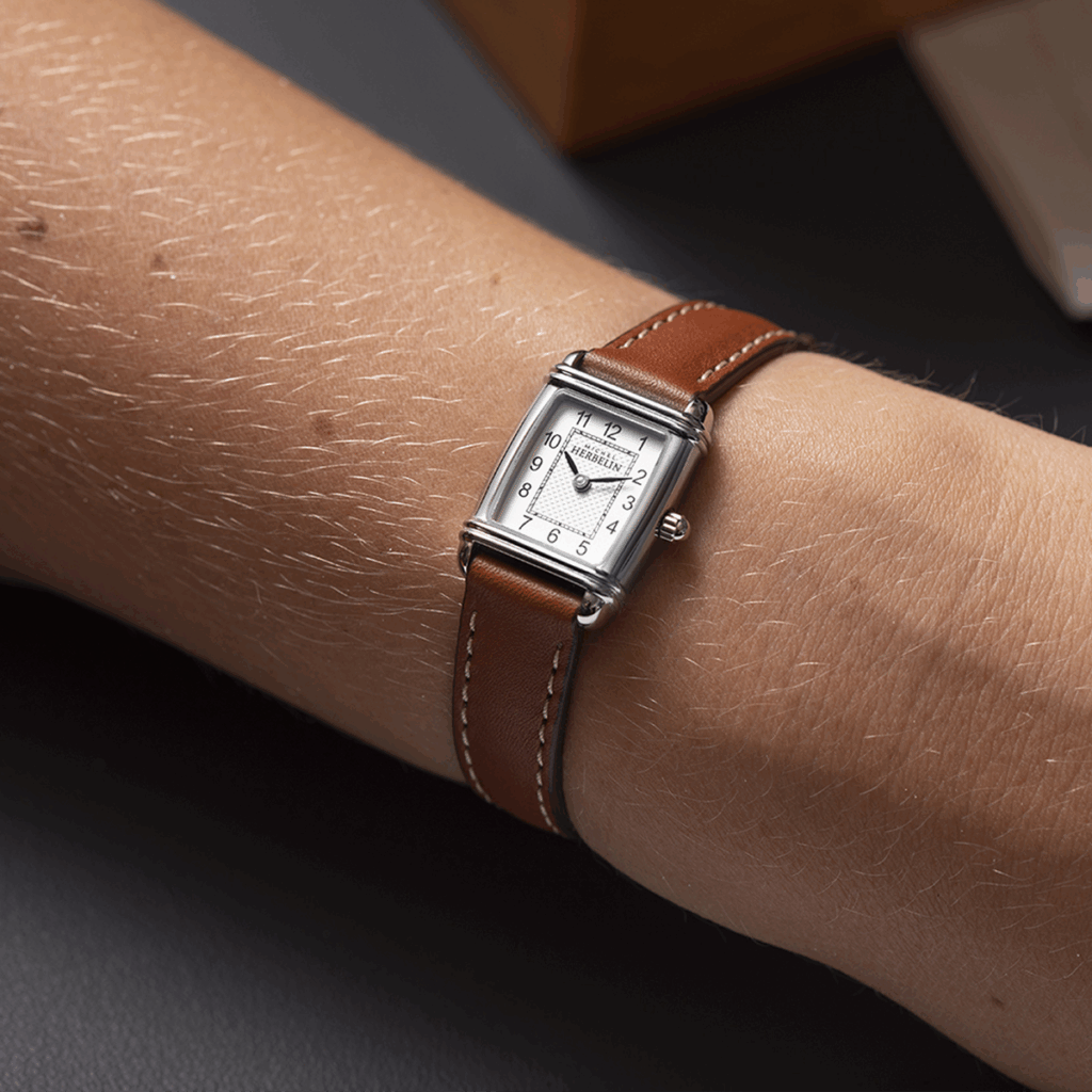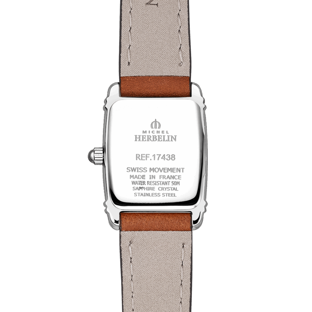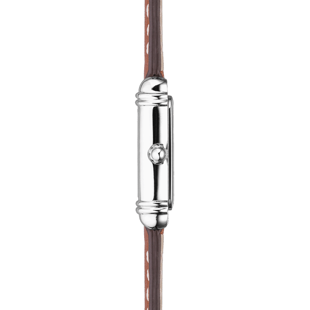 Das goldbraune Lederarmband mit kontrastierenden weißen Ziernähten vollendet den nostalgischen Look und macht die Uhr zum idealen Begleiter für jeden Tag – ob solo getragen oder kombiniert mit weiteren Accessoires für einen femininen, facettenreichen Stil.