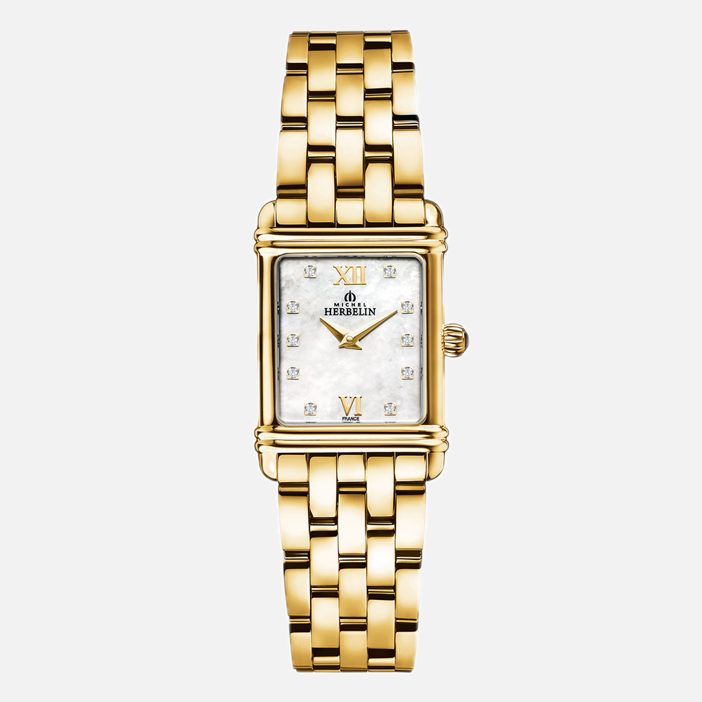 Mit einem hochpräzisen Schweizer Quarzwerk verkörpert diese feminine Uhr technische Exzellenz und Stil. Ihr Edelstahlgehäuse mit Gelbgold-PVD-Beschichtung schützt ein Zifferblatt mit Paris-Clous-Guillochierung, Eisenbahnminuterie und Indizes mit arabischen Ziffern. Die schwarzen Schwertzeiger verleihen dem sorgfältig dekorierten Zifferblatt einen Hauch von Finesse und beleben es.