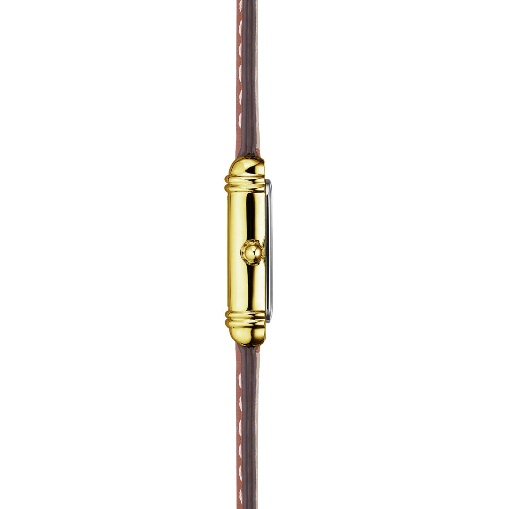 Das goldbraunfarbene Lederarmband mit weißen Nähten rundet das Retro-Design perfekt ab. Eine Uhr, die wie ein Schmuckstück getragen werden kann, allein oder in Kombination mit anderen Accessoires oder Schmuckstücken, für einen ausgesprochen femininen Stil.