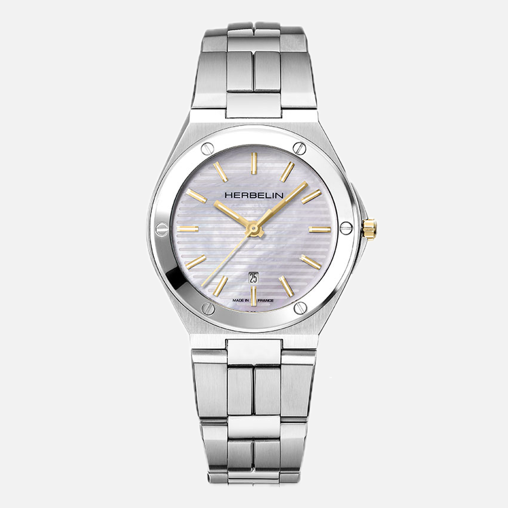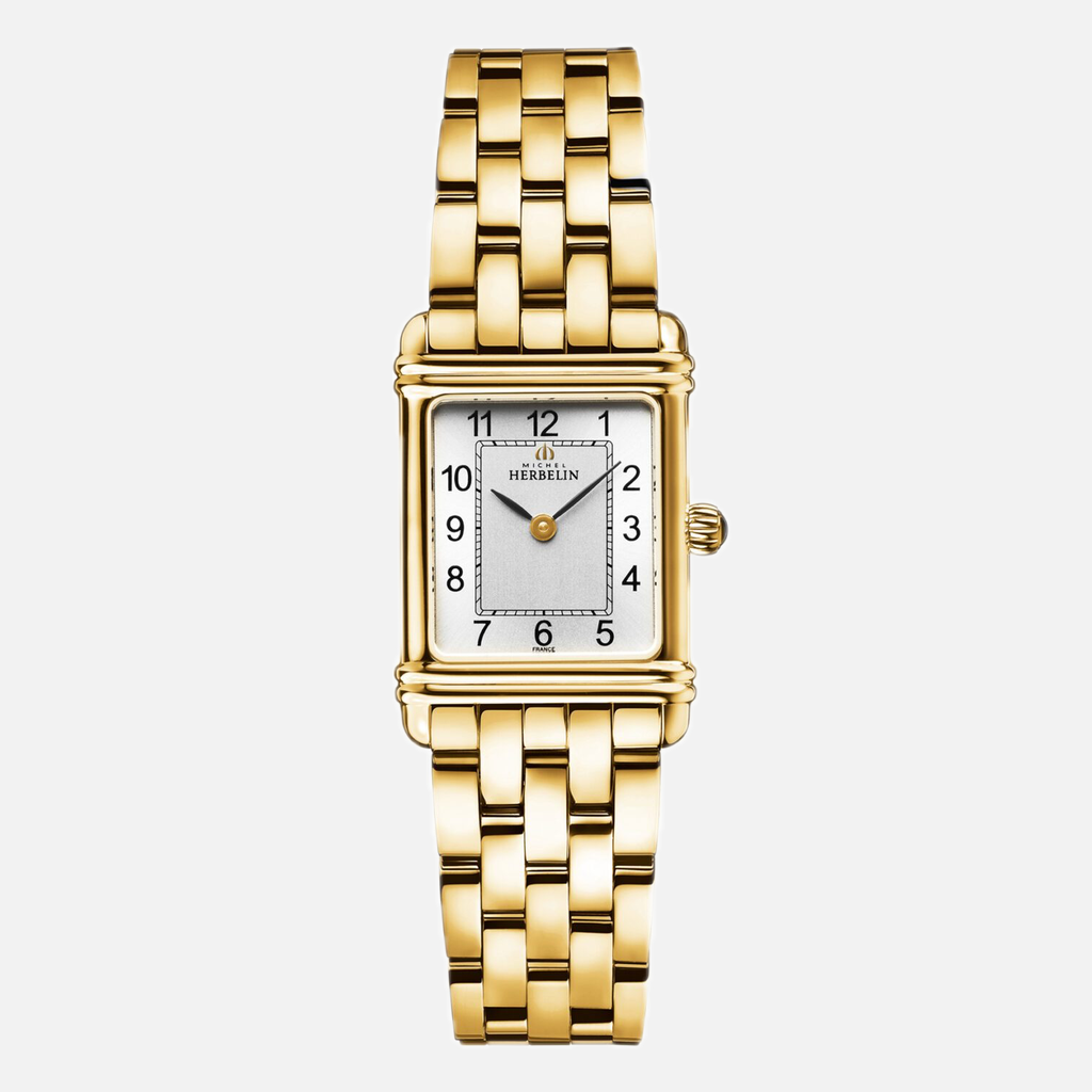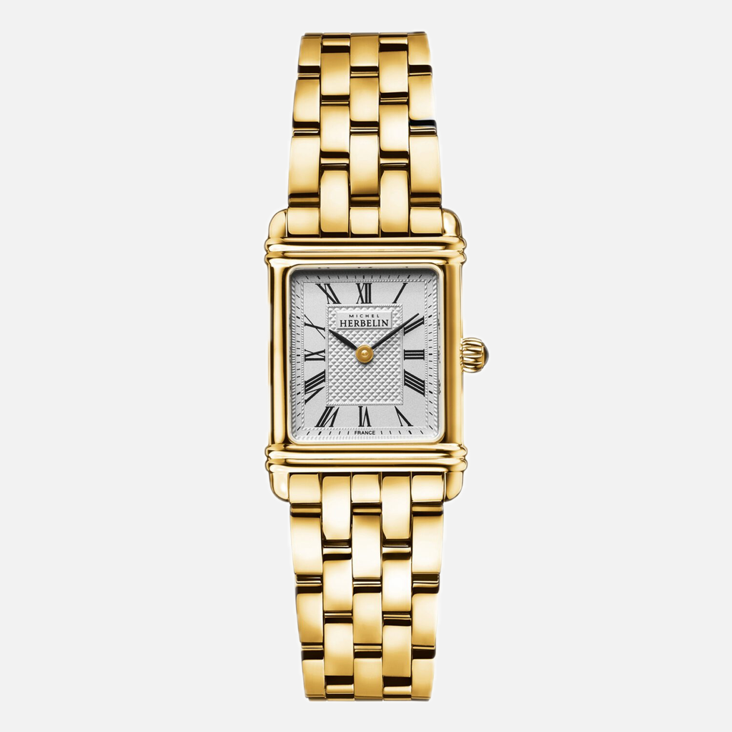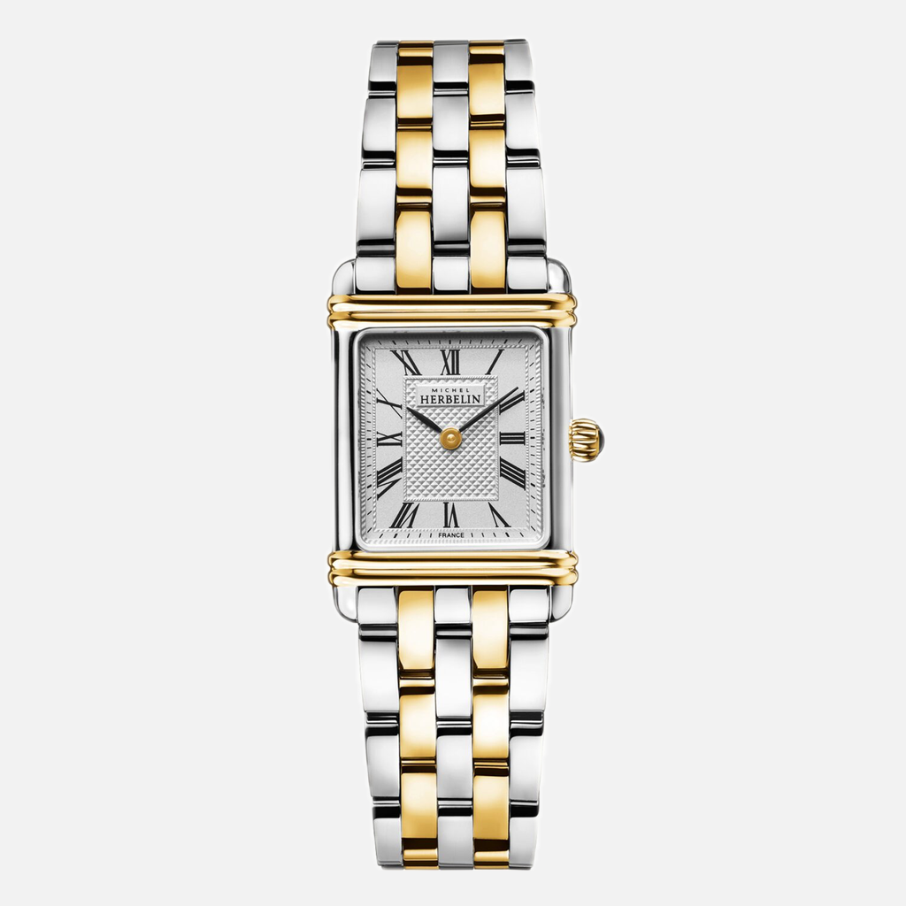 Die bicolorfarbene Damenklassikuhr präsentiert sich mit eckigem Gehäuse im Retrodesign. Unter dem kratzfesten Saphirglas ruht ein silberfarbenes Zifferblatt mit römischen Ziffern, das den Art Déco Stil elegant fortführt. Im Innern des Edelstahlgehäuses tickt ein Schweizer Quarzwerk. Das attraktive Gliederarmband aus Edelstahl schmiegt sich angenehm um das Handgelenk und schließt sicher mit einer Doppelfaltschließe .