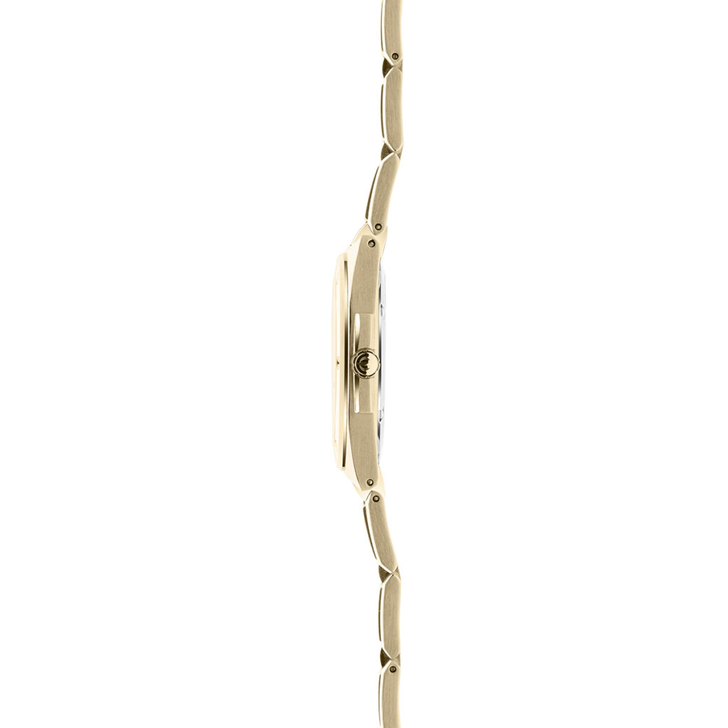 Das goldfarbene Edelstahlarmband überzeugt mit einem modernen Mix aus satinierter und polierter Gliederung, das sich zur Doppelfaltschließe hin verjüngt und einen sicheren Tragekomfort garantiert. Es vollendet die Gesamtposition dieser wunderbaren Neuheit in goldfarbener Optik. Die edle Damenuhr garantiert einen tollen Auftritt, egal zu welcher Gelegenheit. Ein echtes It-piece. Sportlich elgant und ausdrucksstark am Handgelenk.