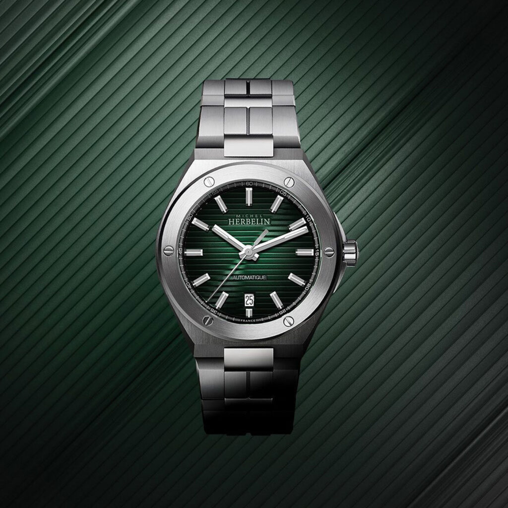 Als Herzstück im Inneren dieser Dreizeigerautomatikuhr schlägt ein Swiss Made Automatikwerk. Die Uhr ist aus hochwertigem Edelstahl gefertigt. Ganz in Edelstahl gehalten, wirkt die Uhr am Handgelenk sportlich und elegant. Das Zifferblatt in Grün kommt durch das mit Streifen versehene French Navy Zifferblatt besonders ausdrucksstark zur Geltung und wird von einem kratzfesten Saphirglas geschützt. Die mit Leuchtmarkierungen ausgestattete silberfarbenen Indizes sowie Stunden- und Minutenzeiger und die Datumsanzeige auf 6Uhr gewährleisten eine gute Ablesbarkeit. Dank der Doppelfaltschließe lässt sich die Automatikuhr sicher befestigen und abnehmen.