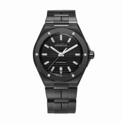 Als Herzstück im Inneren dieser Automatikuhr mit Sichtboden schlägt das Schweizer Werk Sellita 11 ½ SW200-1. Die Uhr ist aus hochwertigem Edelstahl gefertigt und rundum mit einer sehr widerstandsfähigen High-Tech DLC Beschichtung (Diamond-Like-Carbon) veredelt. Ganz in Schwarz gehalten, wirkt die Uhr am Handgelenk markant und sportlich. Das Zifferblatt in Schwarz kommt durch das mit Streifen versehene French Navy Zifferblatt besonders gut zur Geltung und wird von einem kratzfesten Saphirglas geschützt. Die mit Leuchtmarkierungen ausgestattete Indizes sowie Stunden- und Minutenzeiger und die Datumsanzeige auf 6Uhr gewährleisten eine gute Ablesbarkeit. Dank der Doppelfaltschließe lässt sich die Automatikuhr sicher befestigen und abnehmen.