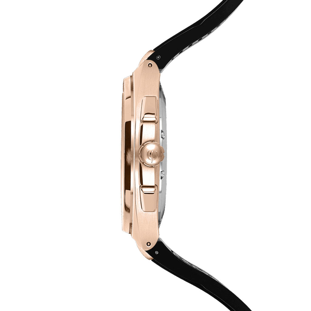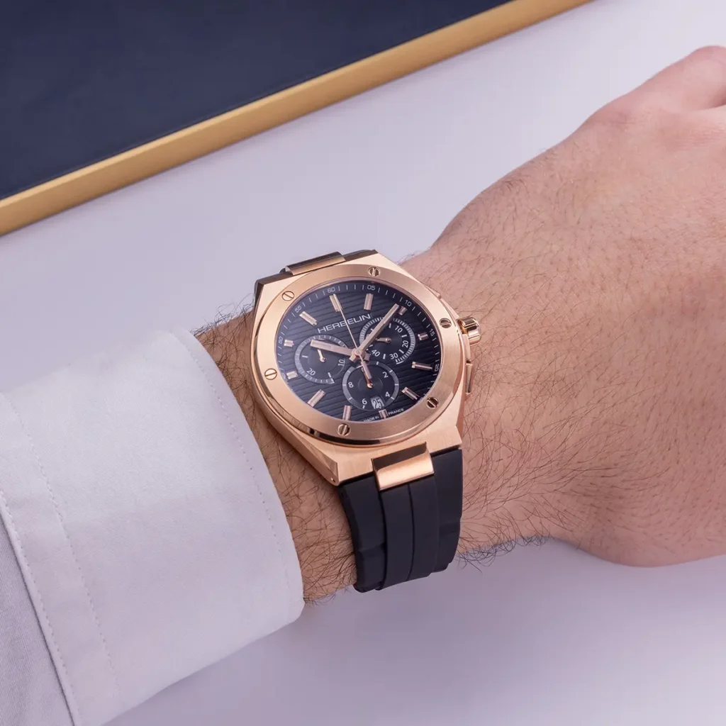 Das runde Gehäuse aus gebürstetem Edelstahl mit PVD Beschichtung präsentiert sich mit einem sportlichen French-Navy-Zifferblatt in Schwarz und mit goldfarbenen Leuchtindizes und -zeigern sowie die Totalisatoren für die Chronographenfunktionen, in der Farbe der Uhr. Diese bringen Lebendigkeit und Eleganz und gewährleisten eine gute Ablesbarkeit der Zeit. Das Schweizer Quarzwerk, die Datumsanzeige auf 6 Uhr und eine Wasserdichte mit bis zu 10 bar (100 M.) runden das Funktionsspektrum ab. Der goldfarbene Chrono ist mit einem powerfullen und robusten schwarzen FKM-Kautschukband ausgestattet, das toll aussieht, einen hohen Tragekomfort hat und mit einer Dornschließe sicher schließt.
