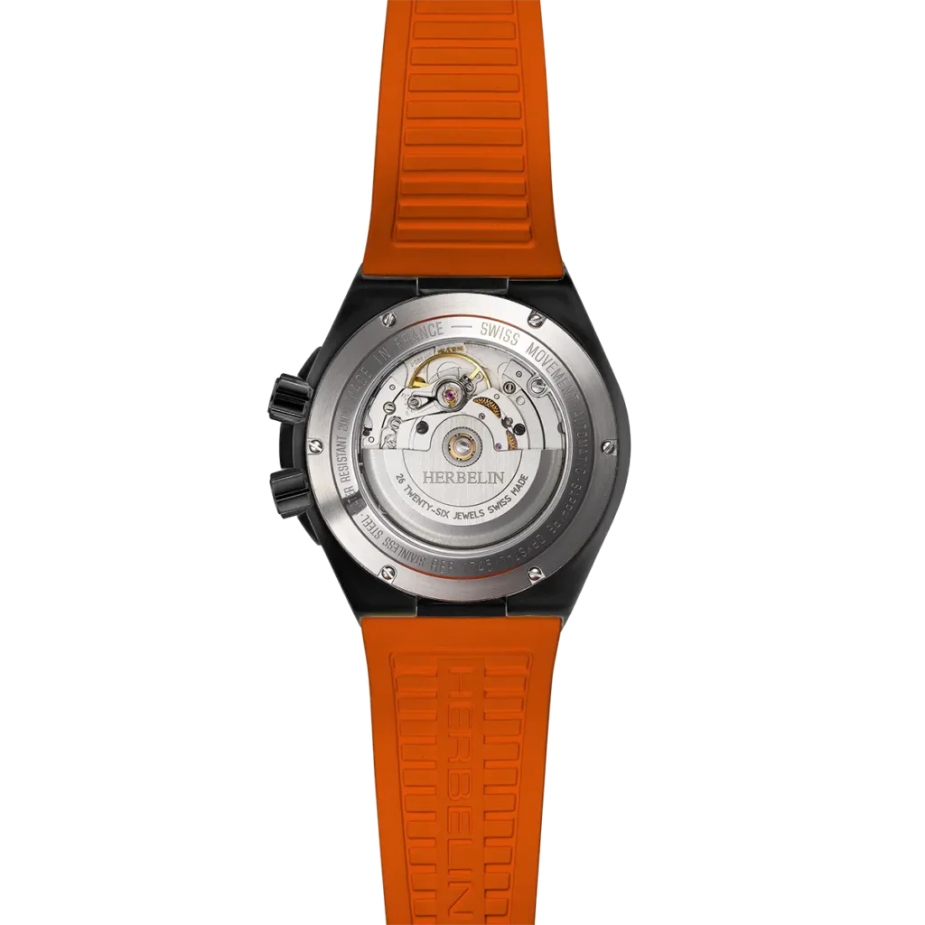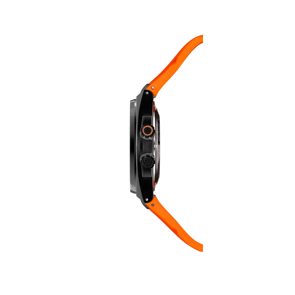 Unter dem einseitig entspiegelten Saphirglas offenbart sich ein markantes Zifferblatt mit schwarzer French-Navy-Musterung und einem zweifarbigen innenliegender Lünettenring für die Tauchanzeige. Der orangefarbene Akzent ist ein Hingucker, der mit dem gleichfarbigen Sekundenzeiger das attraktive Erscheinungsbild der Uhr unterstreicht. Zum echten Eyecatcher wird die Uhr, durch das robuste FKM-Kautschukarmband in demselben Orangeton. Es sorgt für einen angenehmen Tragekomfort und gibt der Uhr ihren sportlichen Touch. Die praktische Dornschließe ermöglicht eine gute Anpassung an das Handgelenk und ein einfaches An- und Ablegen der Uhr.