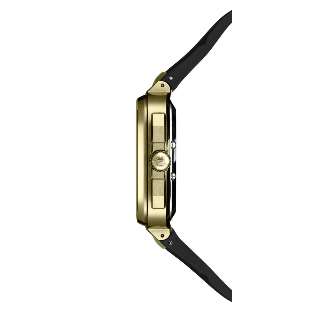 Das Gehäuse aus 316L-Edelstahl mit goldfarbener PVD-Beschichtung überzeugt durch seine hohe Widerstandsfähigkeit und seine matte Optik. Darin eingebettet: ein tiefschwarzes Zifferblatt mit horizontaler Strukturierung, das an maritime Eleganz der Linie erinnert. Goldfarbene Totalisatoren für die Chronographenfunktionen unterstreichen die technische Präzision, verleihen der Uhr Tiefe und Ausdruck und geben dem Chronographen sein unverwechselbares Gesicht.