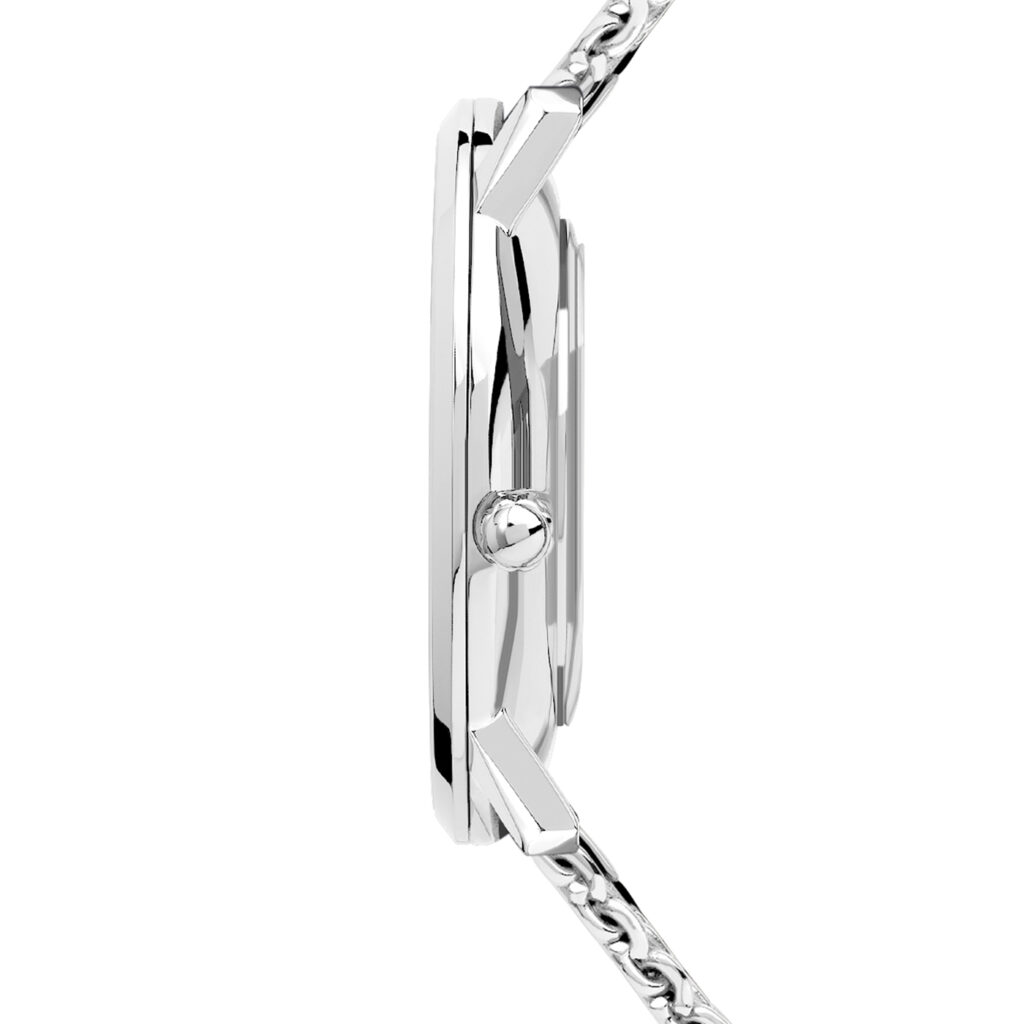 Der Zeitmesser punktet mit einem runden extraflachen Edelstahlgehäuse unter dem ein wunderschönes edles Perlmuttzifferblatt mit minimalistischen Strichindizes ruht. In Kombination mit dem Milanaiseband aus hochwertigem Edelstahlgeflecht wird das Timepiece zu einem besonderen Eyecatcher. Ein Highlight für moderne Klassiker. Das Modell verfügt über ein hochwertiges Schweizer Quarzuhrwerk und eine Datumsanzeige. Es ist bis zu 3 bar wasserdicht.