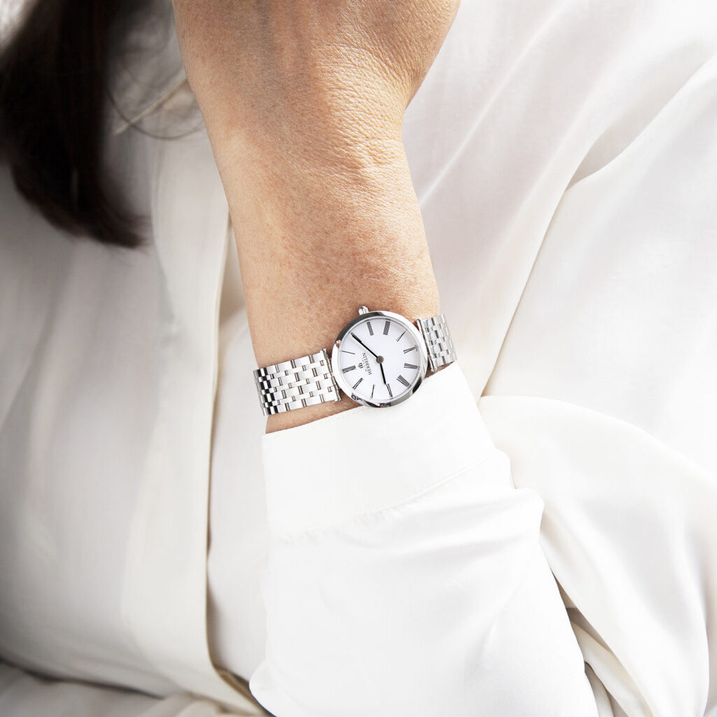Im robusten Edelstahlgehäuse ruht ein zuverlässiges Swiss Made Quarzwerk, geschützt von kratzfestem Saphirglas. Die minimalistische Zifferblattgestaltung in strahlendem Weiß wird von schlanken Indizes akzentuiert und garantiert jederzeit präzise Ablesbarkeit.