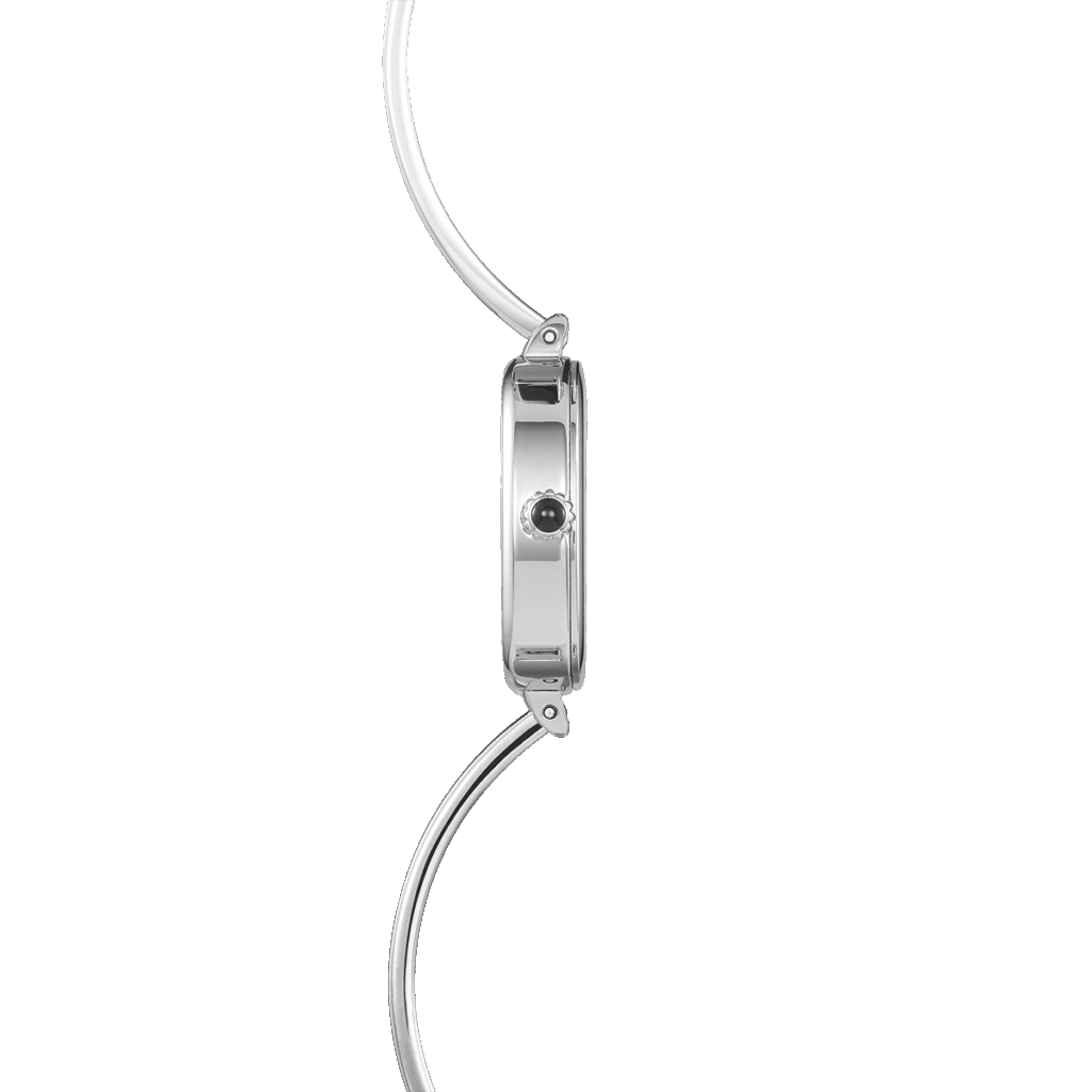 Die feminine Zweizeigeruhr FIL mit der Schmuckspange ist ein echtes It-Piece und geht mit ihrem topaktuellen Retrostil ganz mit der Zeit. Ihre schlanken Kurven und das puristische Design betonen die Eleganz des Schlichten. Das spiegelt sich auch in dem auf das Wesentliche reduzierte schwarze Zifferblatt und dem an den Ecken abgerundeten Gehäuse perfekt wieder. Das Spangenband ist mit einer hochwertigen Schmuckschließe ausgestattet und schmiegt sich angenehm um das Handgelenk. Es vollendet den starken Auftritt der FIL. In ihrem Innern tickt ein Schweizer Quarzwerk. Diese wunderschöne Uhr ist ein echter Eyecatcher und prädestiniert für alle Trendsetter, ebenso wie für alle, die gerne weibliche Designs mit Power mögen. Ein Hauch der Seventies umgibt die FIL und macht Freude auf den kommenden Frühling und etwas mehr Leichtigkeit.