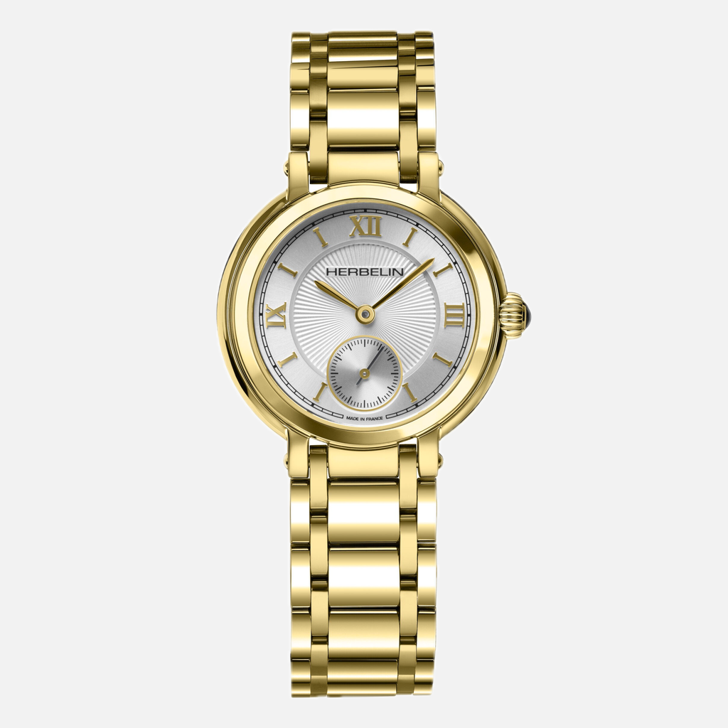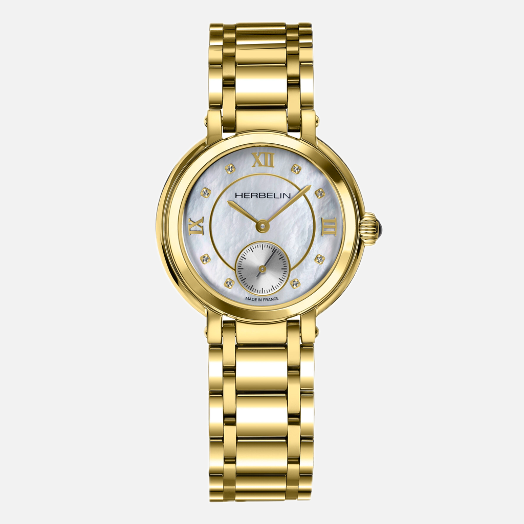 Diese wunderschöne klassisch elegante Uhr aus der Linie Galet gibt es nun auch in einer gelbgoldfarbenen Variante, die Frauenherzen höherschlagen lässt und richtig gut aussieht. Die Galet ist ein wunderbares Accessoire für jeden Tag. Sie bereichert jedes Outfit und schenkt uns immer eine gut ablesbare Zeit. Sie ist aus hochwertigen Materialien gefertigt und von einem Schweizer Uhrwerk angetrieben. Das Zifferblatt aus Perlmutt mit funkelnden Steinen und kleiner Sekundenanzeige ist der Blickfang dieser Ladieswatch. Römische goldfarbene Ziffern verleihen ihr einen zeitlosen Look. Das hochwertige Gliederarmband aus Edelstahl schmiegt sich angenehm um das Handgelenk und schließt sicher mit einer Faltschließe. Die Uhr wird in einer eleganten Etuibox geliefert.