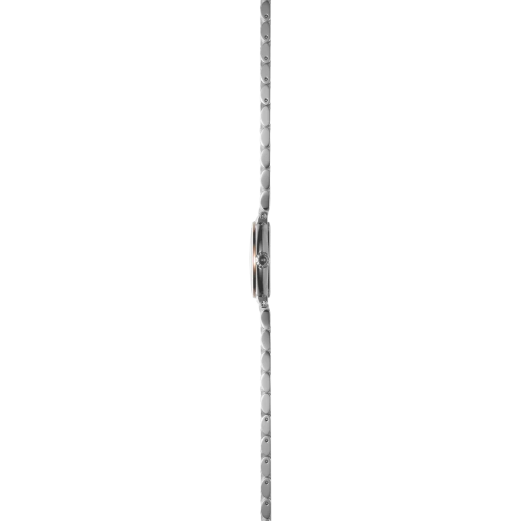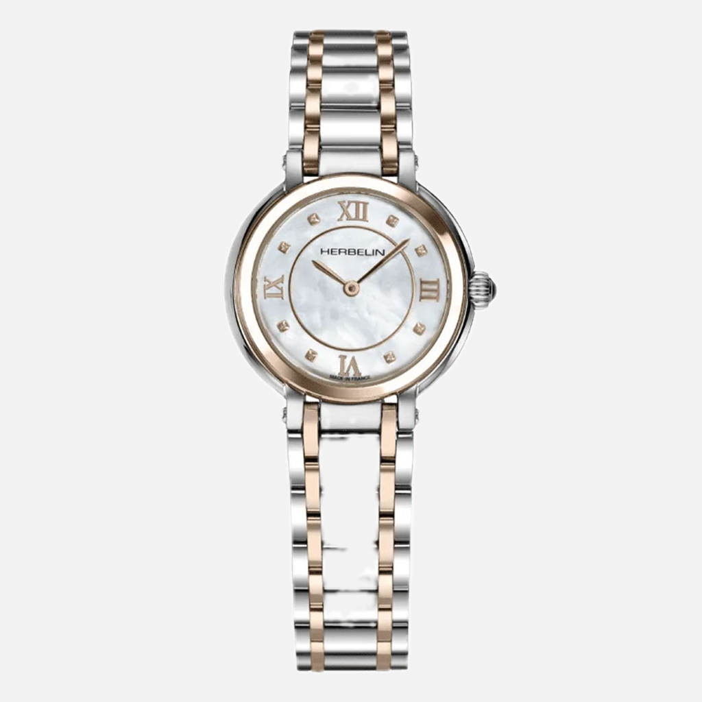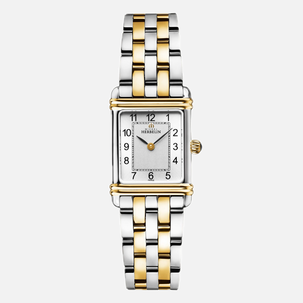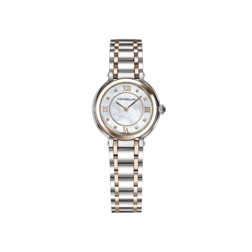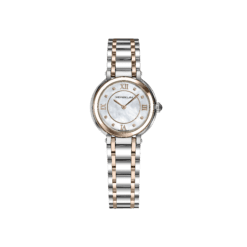 Wunderschön zart und feminin präsentiert sich die Damenuhr Galet. Die Zierliche spricht vor allem Frauen an, die Eleganz und Weiblichkeit schätzen. Mit dem attraktiven Mix aus Edelstahl und einem warmen Goldfarbton erobert die Galet die Frauenherzen im Sturm. Ein schöner Blickfang ist das edle und in hellen Farbnuancen schimmernde Perlmuttzifferblatt, das mit goldfarbenen römischen Ziffern und funkelnden Steinen bestückt ist. Gemeinsam mit den gleichfarbigen Zeigern bewirken diese eine gute Ablesbarkeit der Zeit. Im Innern der Uhr tickt ein Schweizer Quarzwerk. Das fein gegliederte Metallband vollendet den bicolorfarbenen Auftritt und schließt sicher mit einer hochwertigen Doppelfaltschließe. Mit diesem Timepiece haben Sie ein wunderbares Accessoire an Ihrer Seite, das zu vielen Outfits passt und sie immer gut aussehen lässt. Die Galet wird in einer eleganten Etuibox geliefert.