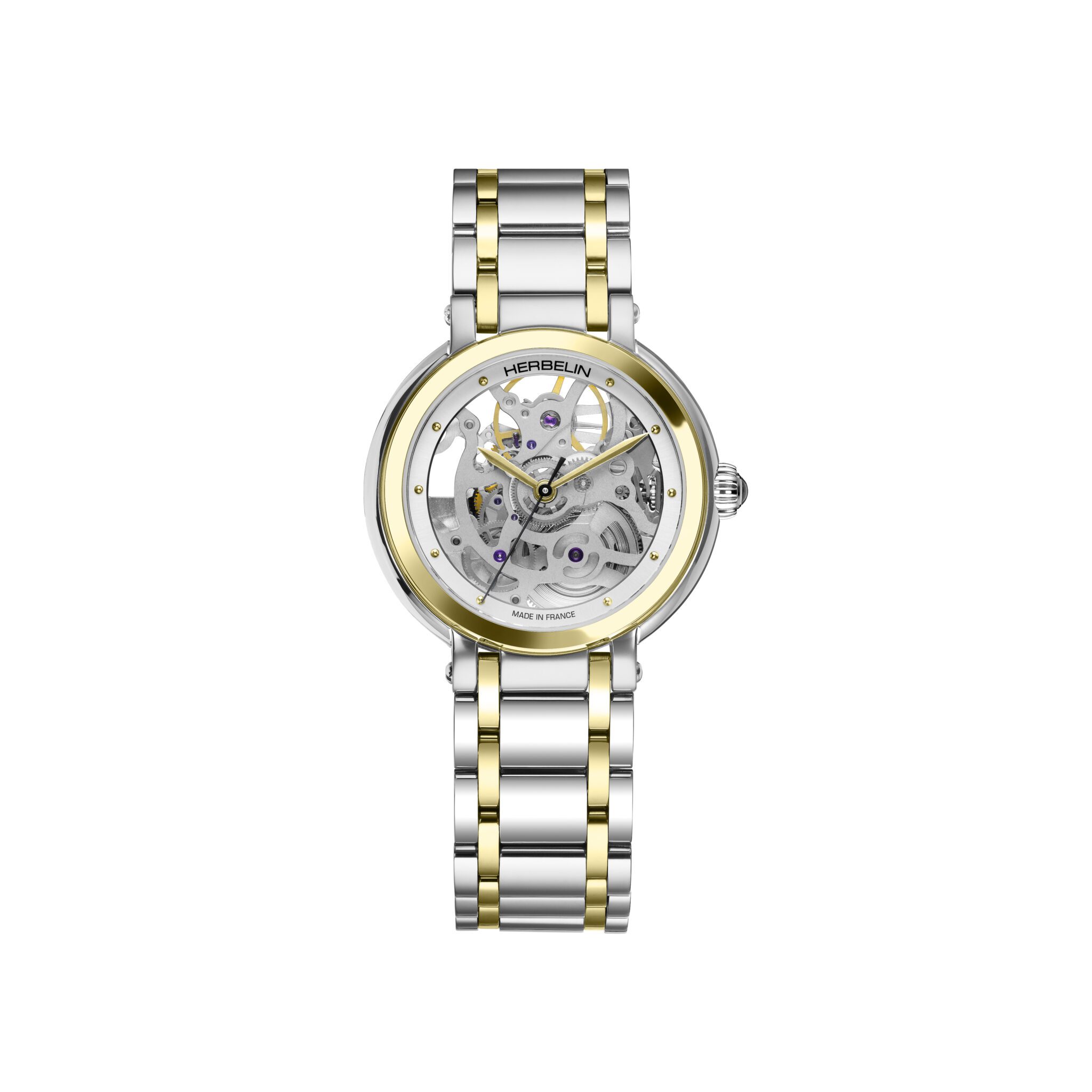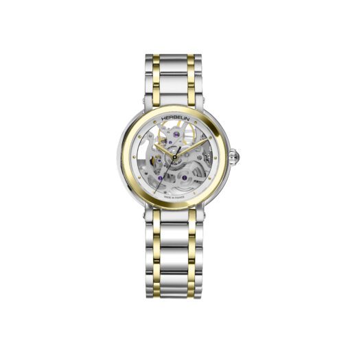 Bicolor, klassisch, elegant, besonders. Die skelettierte Damen-Automatikuhr der Linie GALET begeistert einfach auf den ersten Blick. Ausgestattet mit einem skelettierten Uhrwerk der Schweizer Marke Sellita legt sie den Blick auf die wunderschöne Orchestrierung frei und das gleich von beiden Seiten. Ihr bicolor gold-silberfarbenen Erscheinungsbild aus Edelstahl mit PVD Gold Beschichtung, die hochwertigen Materialien und Komponenten überzeugen natürlich vor allem die anspruchsvollen Liebhaberinnen von Automatikuhren. Ihr feminines Design und die feinen Nuancierungen wie die goldfarbenen Zeiger mit schwarzer Zentralsekunde und der schwarze Cabochon auf der Zwiebelkrone vollenden den Auftritt der Ladieswatch. Das bicolorfarbene und fein gegliederte Edelstahlarmband schmiegt sich angenehm um das Handgelenk und schließt sicher mit einer Faltschließe. Die Uhr ist bis zu 5 bar wasserdicht. Fast wie ein Schmuckstück anmutend, verschönert der Eyecatcher jedes Outfit und macht es noch exklusiver. Die Uhr wird in einer eleganten Etuibox geliefert.