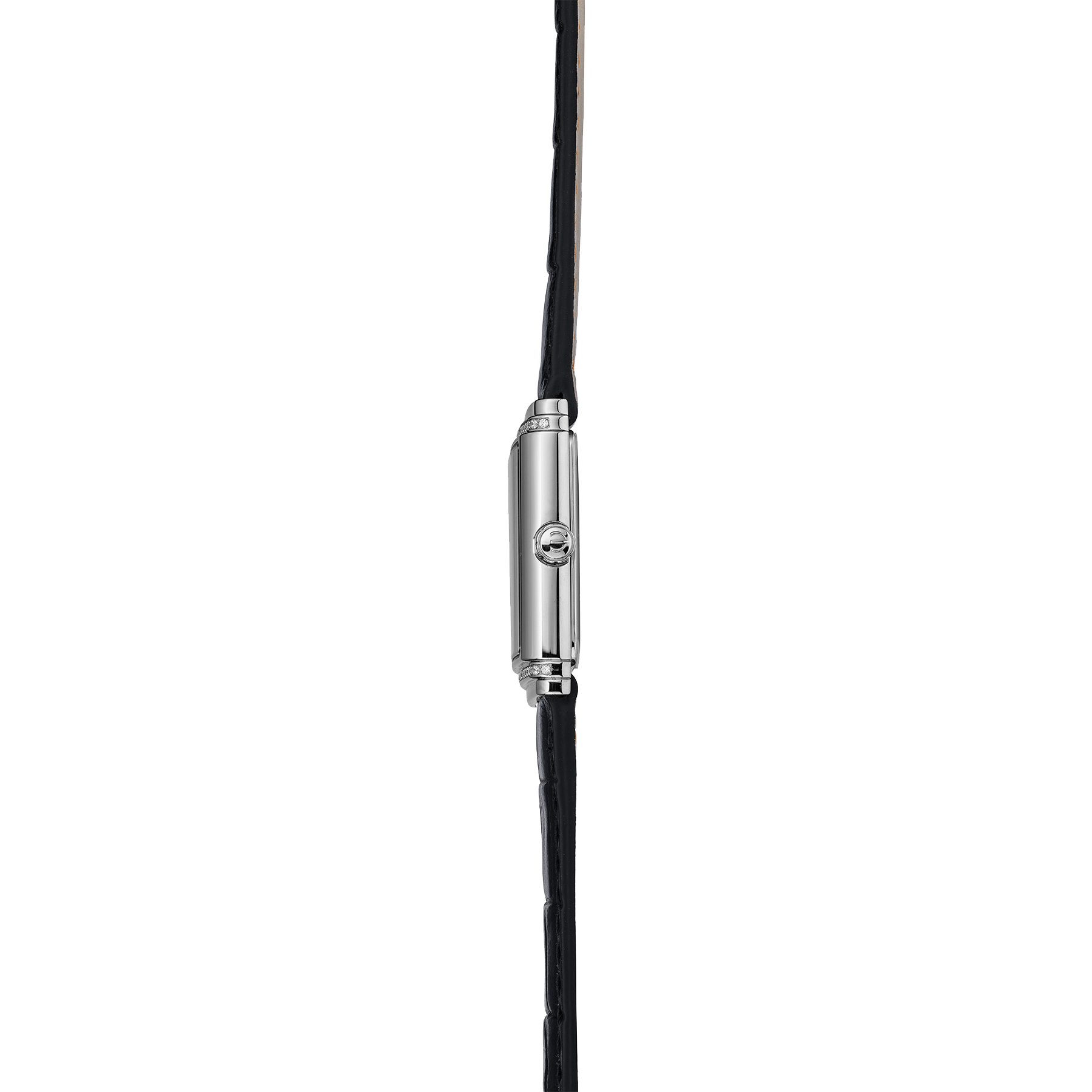 Das facettierte eckige Gehäuse aus hochwertigem Edelstahl setzt ein klares stilistisches Statement. Besetzt mit 40 echten Diamanten, fängt es das Licht aus jedem Winkel ein und verleiht der Uhr eine exklusive Ausstrahlung. Das Zifferblatt greift dekorative Elemente der Art Déco-Bewegung der 1925er Jahre auf und erinnert an die elegante Ästhetik dieser Epoche. Abgerundet wird das Design durch ein schwarzes, geprägtes Lederarmband, das klassisch-elegant wirkt und sich harmonisch in den luxuriösen Gesamtauftritt einfügt.