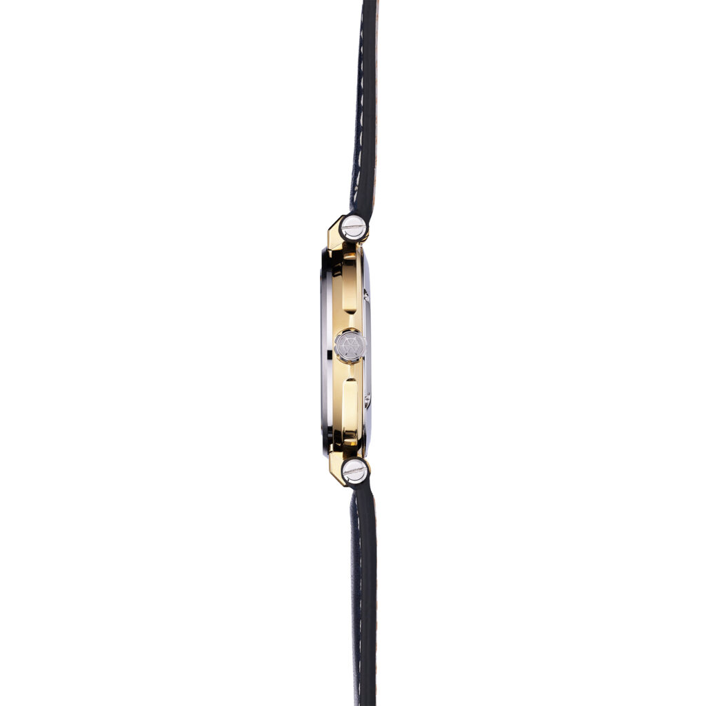 Inspiriert vom maritimen Erbe der Newport-Kollektion zeigt sich diese Damenvariante in einer raffinierten Kombination aus Blau und Gold. Das runde 35-mm-Gehäuse aus hochwertigem 316L-Edelstahl mit gelbgoldfarbener PVD-Beschichtung verleiht der Uhr ihren luxuriösen Glanz. Sechs dekorative Schrauben auf der Lünette zitieren das charakteristische Newport-Design.