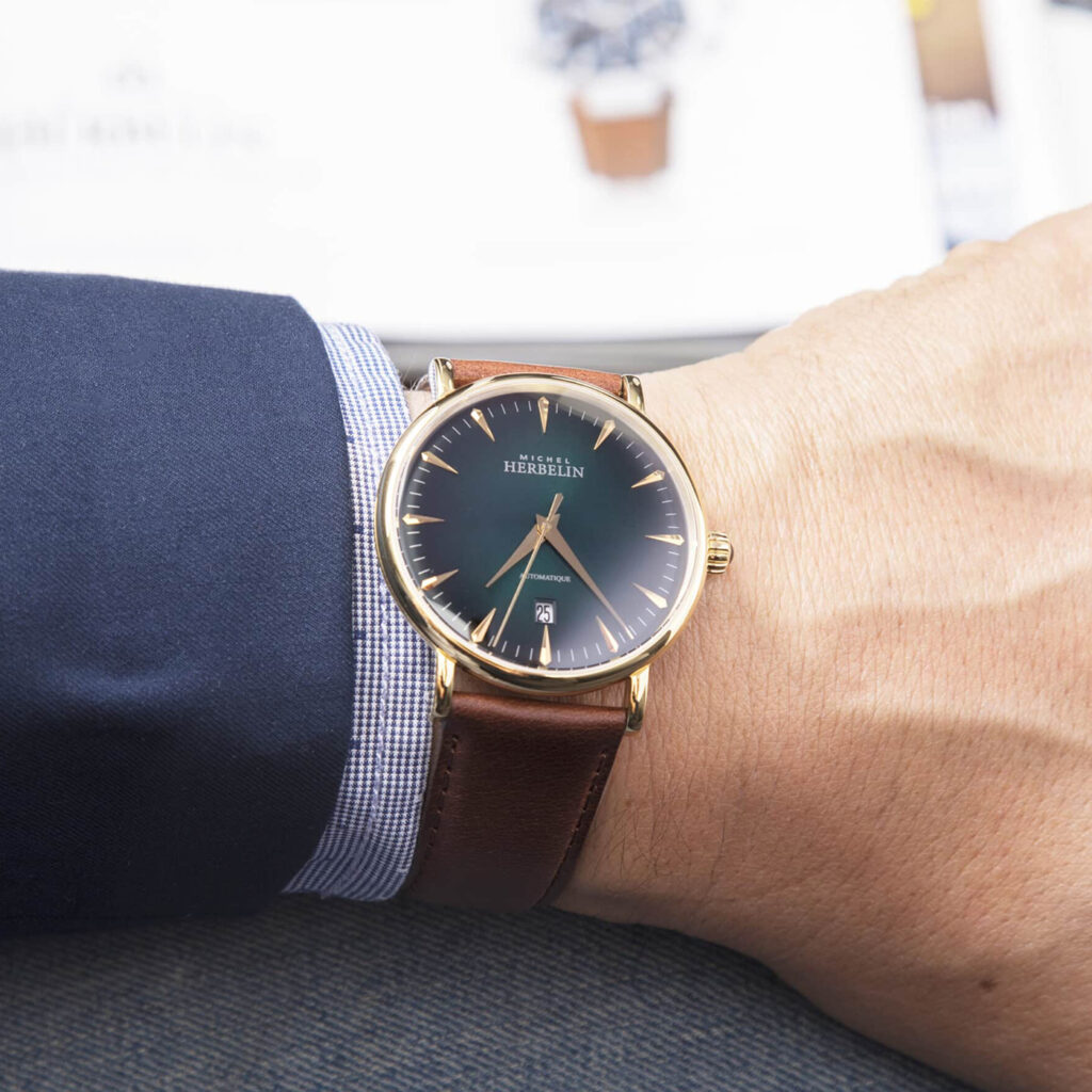 Das attraktive Dreizeigermodell INSPIRATION im Retrostil vereint „sieben Jahrzehnte der Uhrmacherleidenschaft“ von HERBELIN in sich. Gekonnt transportiert sie den Look der 1950er Jahre auf klassisch moderne Weise in die heutige Zeit. Der Automatik-Zeitmesser ist mit einer hochwertigen Schweizer Präzisionstechnik und besten Materialien und Komponenten ausgestattet. Die INSPIRATION gefällt mit einem Gehäusedesign aus poliertem Edelstahl (40 mm) mit goldfarbener PVD-Beschichtung und gewölbtem Saphirglas, dessen durchweg sanft abgerundete Konturen sich bis zum Bandanstoß durchziehen. Darunter birgt sie ein leicht erhöhtes gewölbtes Zifferblatt mit einem gebürstetem Sonnenschliff in einem intensiven, je nach Lichteinfall changierenden Grünton.