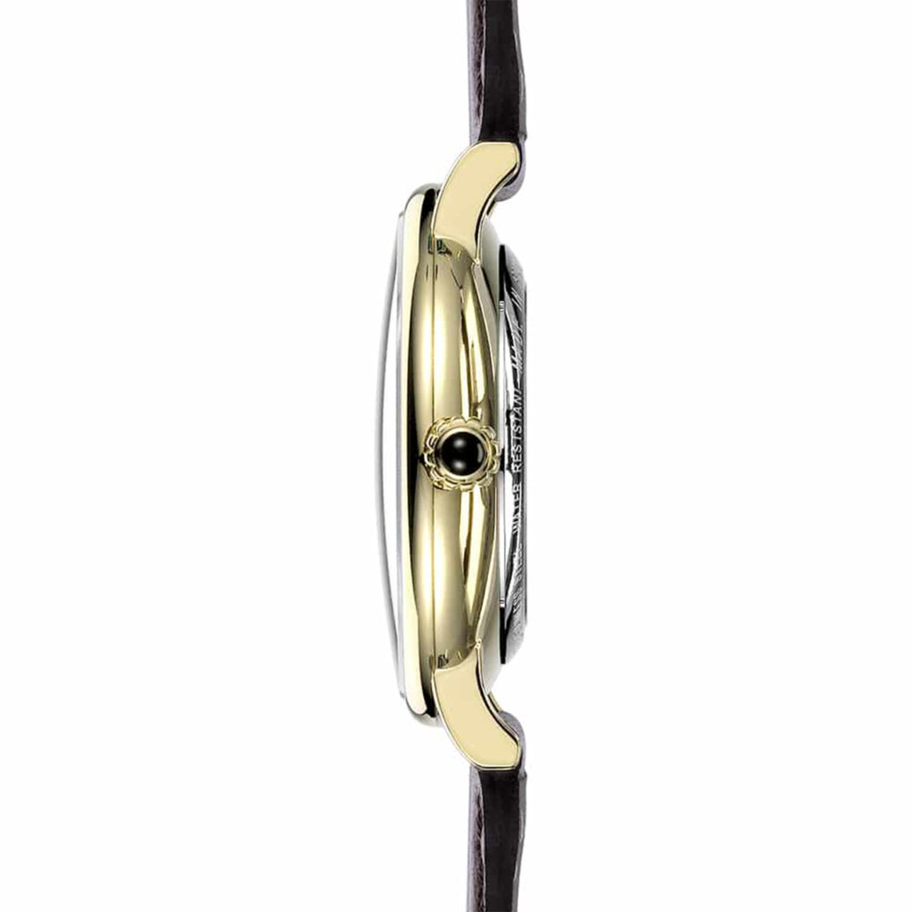 Das zeitlose Design wird von den zwei Uhrenzeigern in fein geschwungener Schwertform und einer klar strukturierten Minuterie, die wiederum von silberfarbenen Stundenindizes unterbrochen wird, konsequent fortgeführt. Ästhetische Details wie die mit schwarzem Onyxs ausgestattete Krone und das handgearbeitete mit Patina versehene Rindslederband unterstreichen die Eleganz des zeitlosen Designs dieses Zeitmesser auf besondere Weise.