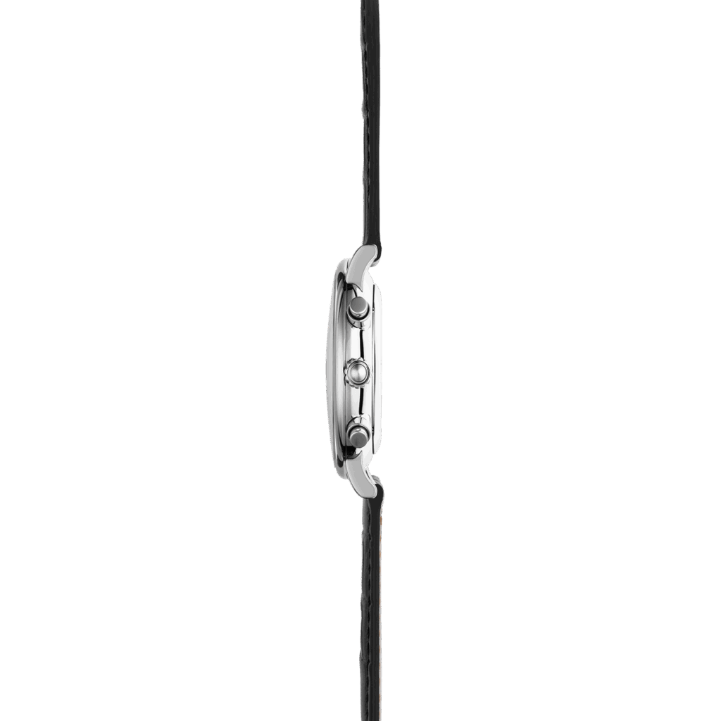 Das runde Edelstahlgehäuse ist Ø 40 mm groß und begeistert mit einem schwarzen Retro-Zifferblatt, das die Blicke auf sich zieht. Die Inspiration im Retrostil ist die perfekte Mischung aus Vintage und Moderne! Dies bewirkt das Zusammenspiel des filigranen silberfarbenen Zeigerspiels, der schlanken Indizes und der Totalisatoren für die zusätzlichen Chronographenfunktionen samt Minuterie.