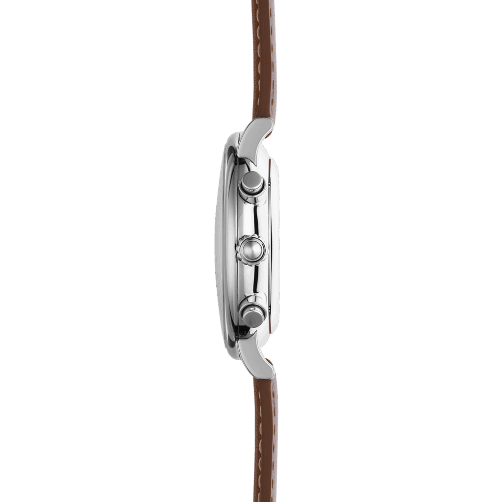 Sie beleben das Zifferblatt und ziehen die Blicke gekonnt auf sich. Das gewölbte Glas und Zifferblatt sowie die Zwiebelkrone perfektionieren das edle Retrodesign. Der Zeitmesser ist mit einem Schweizer Quarzwerk und besten Materialien und Komponenten ausgestattet. Das Lederband in einem modischen Braunton vollendet den starken Auftritt dieses trendigen Vintage-Chronos. Die Farbkombination der Inspiration sieht einfach toll aus und passt zu vielen Outfits. Mit diesem Chronographen sind Sie Sie auf jeden Fall immer gut angezogen und stets “up-to-time”!