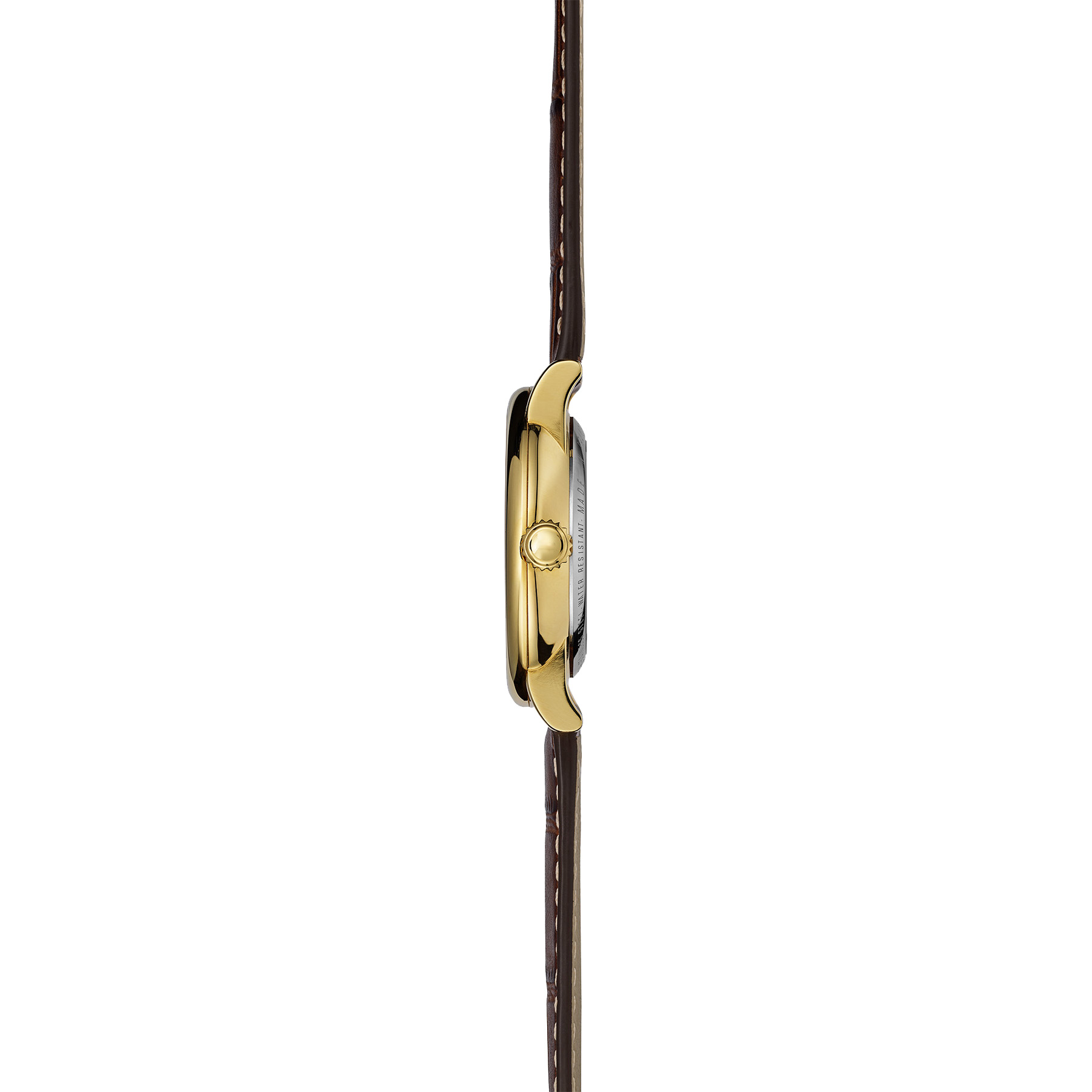 Dieses attraktive Klassikmodell aus der Linie INSPIRATION vereint Tradition und moderne Raffinesse: Das goldfarbene PVD-Edelstahlgehäuse strahlt eine warme, edle Eleganz aus und harmoniert perfekt mit dem matt silberfarbenen, guillochierten Zifferblatt. Schwarze römische Ziffern verleihen dem Design Tiefe und Charakter. Das braune Lederband in klassischer Prägung setzt einen stilvollen Vintage-Akzent – zeitlos, kultiviert und ausgewogen.