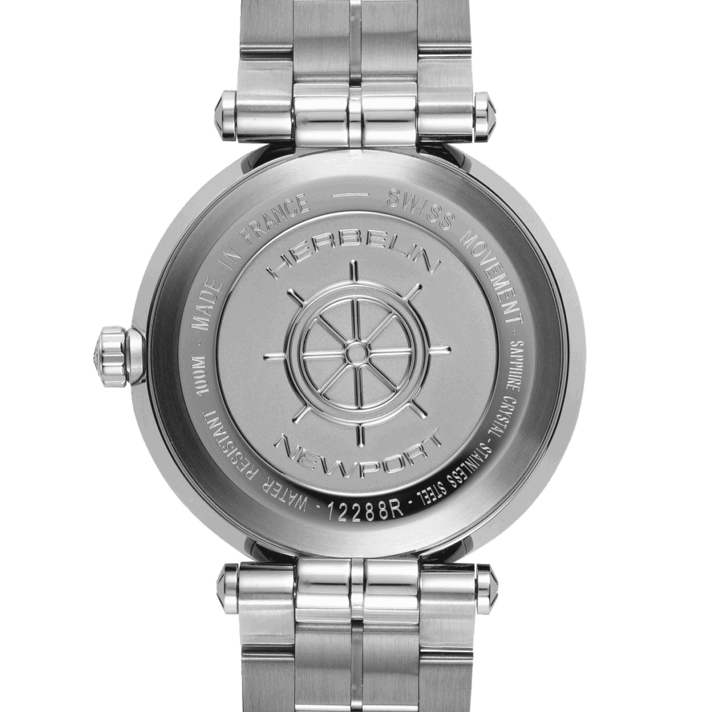 Die Leidenschaft der Familie Herbelin für den Segelsport zieht sich durch die DNA dieser sportlich eleganten NEWPORT Dreizeigeruhr aus Edelstahl: zentrale Bandanstöße, eine Lünette im Design eines Bullauges, der diskret eingravierte Schriftzug NEWPORT und die mit fünf Zierschrauben versehene Lünette,die an die Seilwinde von Segelschiffen erinnert prägen den maritimen Look der Newport.