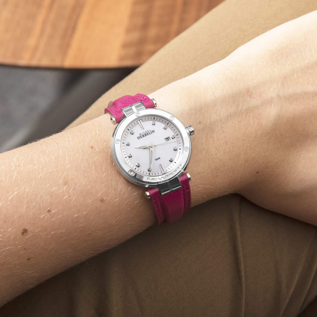 Die sportlich elegante Damenuhr aus der Erfolgslinie Newport überzeugt mit einem wunderschönen Design, hochwertigen Materialien und erstklassiger Verarbeitung. Das klassisch runde Gehäuse aus poliertem Edelstahl begeistert mit einem dezent schimmernden Zifferblatt aus hellem Perlmutt. Für den luxuriösen Glamour sorgen funkelnde Diamanten, die mit den Leuchtindizes als Stundenmarkierungen dienen. Ein innenliegender Minutenring optimiert die Ablesbarkeit der Dreizeigeruhr.