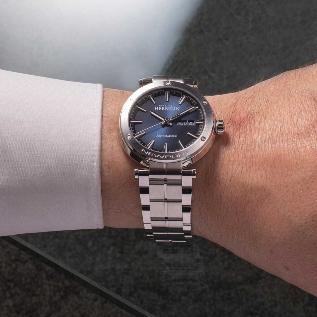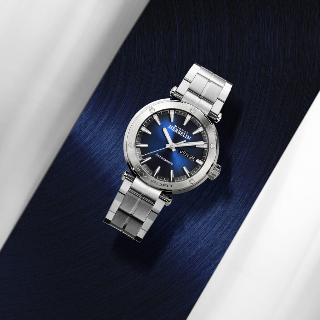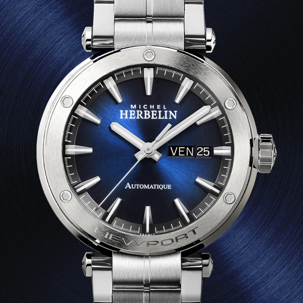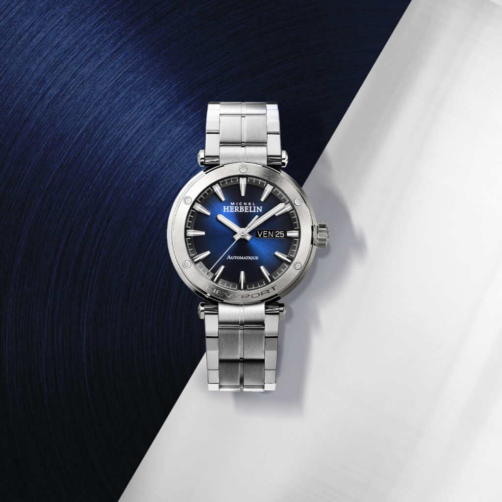 Die Leidenschaft der Familie Herbelin für den Segelsport zieht sich durch die DNA dieser sportlich eleganten NEWPORT Dreizeigerautomatikuhr aus Edelstahl: zentrale Bandanstöße, eine Lünette im Design eines Bullauges, der diskret eingravierte Schriftzug NEWPORT und die mit fünf Zierschrauben versehene Lünette, erinnert an die Seilwinde von Segelschiffen.