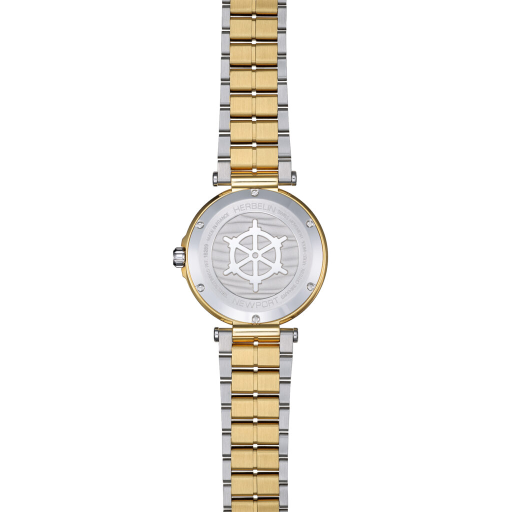 Inspiriert vom maritimen Erbe der Newport-Kollektion präsentiert sich diese Damenvariante in einer edlen Farbkombination aus Edelstahl und Gold – ein harmonisches Zusammenspiel von Stärke und Eleganz. Das 35 mm große Gehäuse aus hochwertigem 316L-Edelstahl wird durch eine fein abgestimmte gelbgoldfarbene PVD-Beschichtung veredelt. Diese sorgt für einen warmen Glanz, der die Linien des Gehäuses sanft betont. Sechs dekorative Schrauben auf der Lünette greifen das charakteristische Newport-Design auf und verleihen der Uhr ihren unverkennbaren Wiedererkennungswert – ein Symbol französischer Raffinesse und moderner Weiblichkeit.