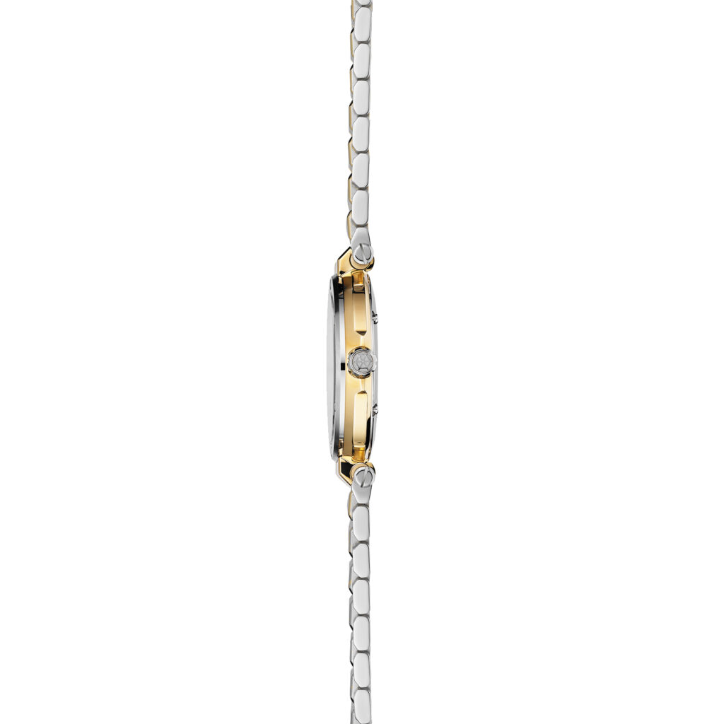 Das fein gearbeitete bicolorfarbene Edelstahlarmband mit goldfarbenen Akzenten und komfortabler Faltschließe fügt sich nahtlos ins Gesamtbild ein und rundet die luxuriöse Anmutung perfekt ab.