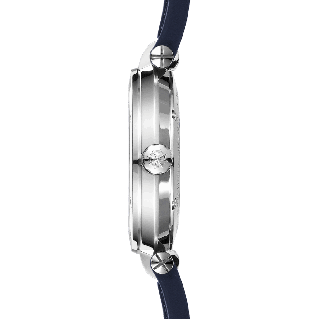 Es ruht in einem runden Gehäuse aus gebürstetem Edelstahl und wird von einem kratzfesten Saphirglas geschützt. Das newportblaue Kautschukband aus hochwertigem und robustem FKM-Kautschuk verleiht dem edlen Eyecatcher den letzten Schliff. Das Band überzeugt durch eine Doppelfaltschließe, die einen hohen und sicheren Tragekomfort garantiert. Die Uhr ist bis zu 10 Bar wasserdicht.