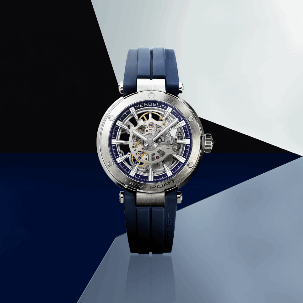 Die Herrenautomatikuhr der beliebten Newport Kollektion offenbart sich mit einem komplett transparenten Zifferblatt und Gehäuseboden. Auf diese Weise wird das in der Schweiz und speziell für HERBELIN gefertigte skelettierte Uhrwerk von Sellita mit 41 Stunden Gangreserve gekonnt in Szene gesetzt.