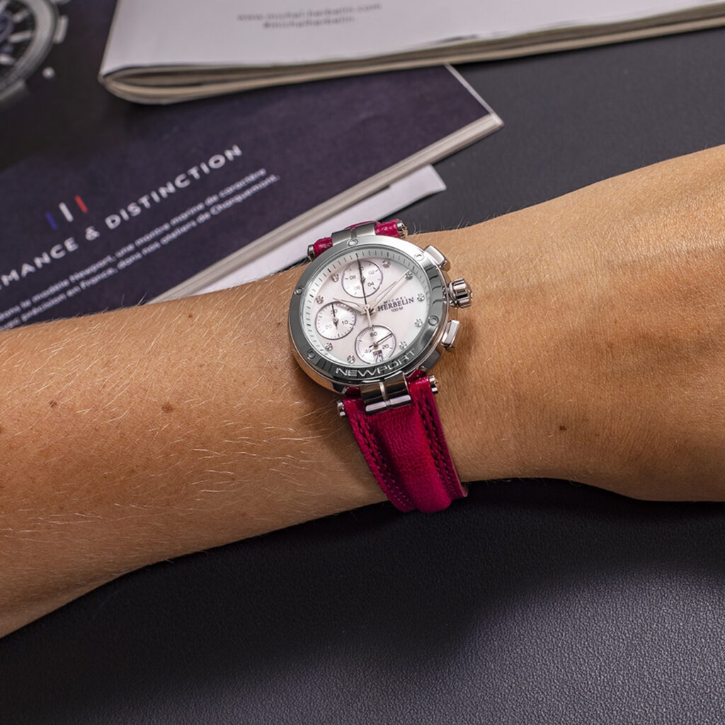 Die sportlich eleganten Damenchronographen aus der Erfolgslinie Newport von HERBELIN überzeugen mit einem wunderschönen Design, hochwertigen Materialien, erstklassiger Verarbeitung und einem Schweizer Quarzwerk. Das klassisch runde Gehäuse aus poliertem Edelstahl begeistert mit einem edlen Zifferblatt aus Perlmutt. Ein innenliegender Minutenring optimiert die Ablesbarkeit. Ergänzt wird diese durch die Chronographen-Funktionen der Totalisatoren mit kleiner Sekunde und Zähler für 1/10 Sekunden und 30 Minuten. Im Innern des ausdrucksstarken Damenchronographen tickt akkurat und zuverlässig ein Schweizer Quarzwerk der Marke RONDA. Er ist aus kratzfestem Saphirglas ist bis zu 10 bar (100 Meter) wasserdicht.