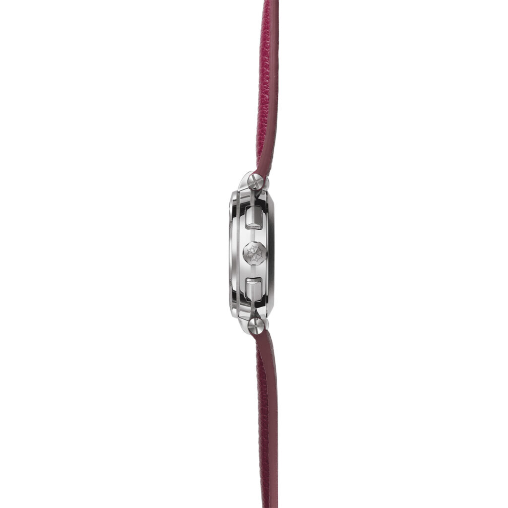 Für den luxuriösen Glamour sorgen funkelnde Diamanten, die als Stundenmarkierungen dienen. Zum Eyecatcher avanciert der Zeitmesser in Kombination mit dem tollen hochwertigen Lederband in einem tollen Fuchsia-Rotton. Mit Sicherheit zieht er alle Blicke auf sich und verschönert mit seiner positiven Ausstrahlung ihre Outfits.