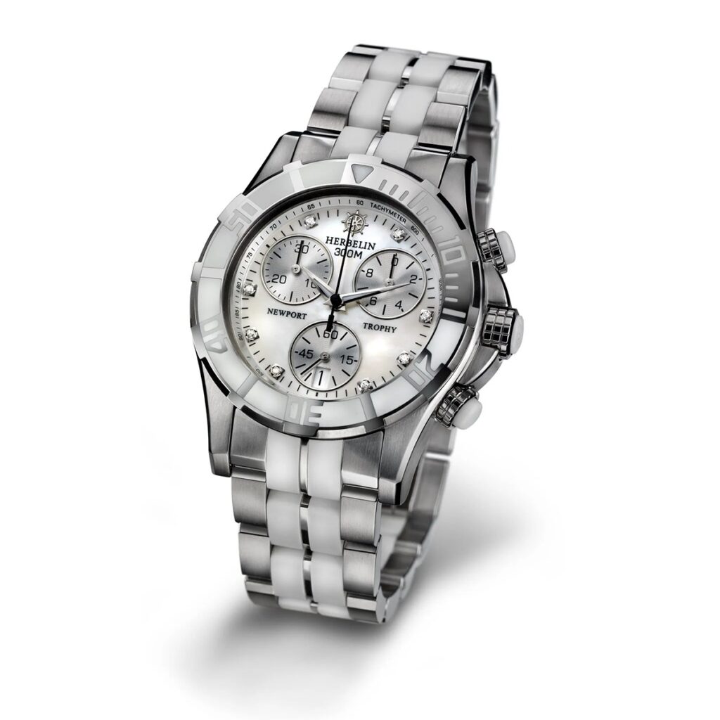 Der sportlich elegante Damenchronograph aus der Erfolgslinie Newport von HERBELIN überzeugt mit einem wunderschönen Design, hochwertigen Materialien, erstklassiger Verarbeitung und einem Schweizer Quarzwerk. Das klassisch runde bicolorfarbene Gehäuse aus poliertem Edelstahl mit weißer High-Tech Keramik sieht toll aus. Es präsentiert sich mit einem edlen Zifferblatt aus hellem Perlmutt und ist mit funkelnden Diamanten besetzt. Ein innenliegender Minutenring optimiert die Ablesbarkeit der Zeit, ebenso die Leuchtzeiger.
