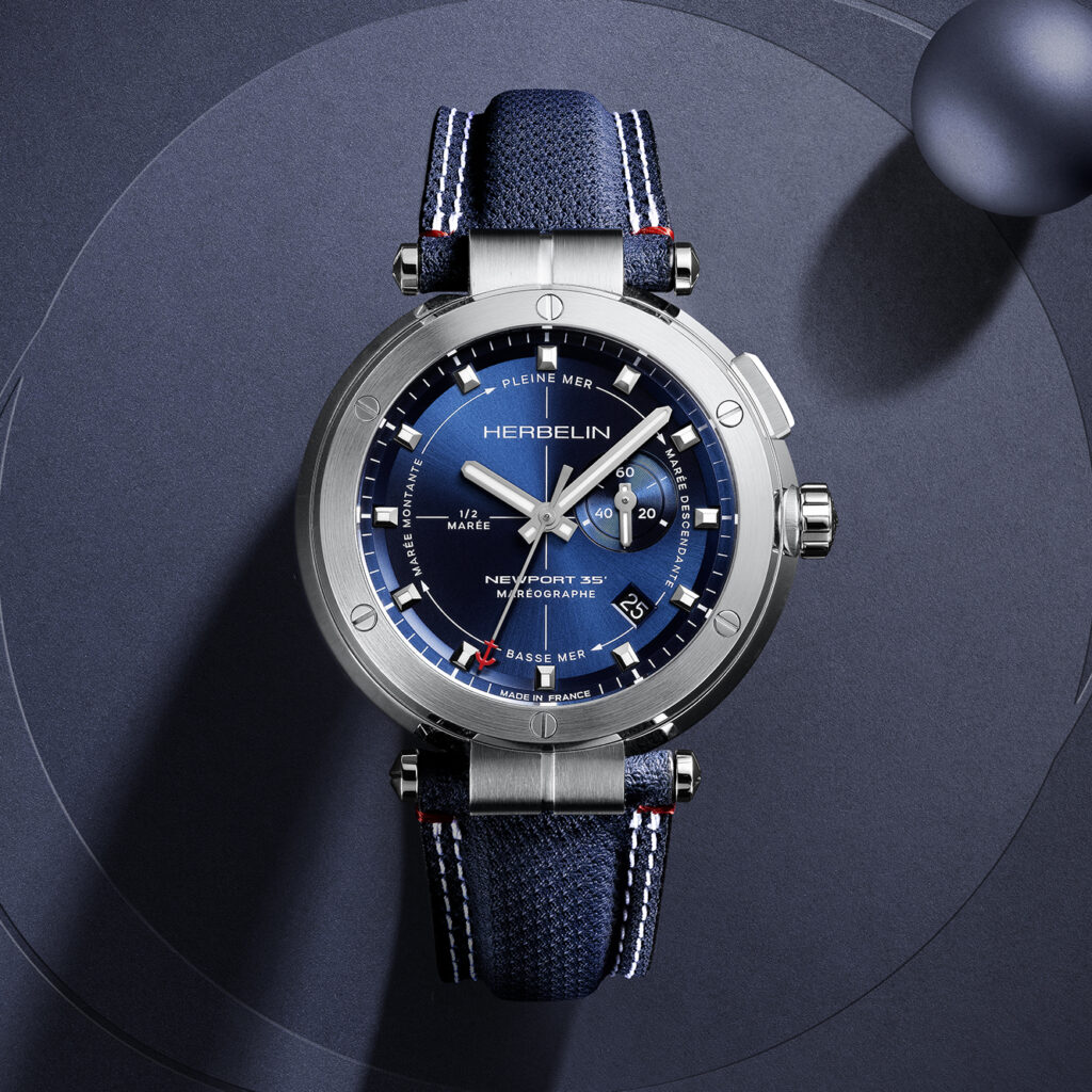 Die Gezeitenuhr ist mit einem Schweizer Quarwerk ausgestattet und bis zu 100 Meter wasserdicht. Das 43 mm große runde Gehäuse wird an einem Lederband-Mix mit einem hochwertigen High-TechTextil in Blau mit weißen Steppnähten getragen, das den sportlich schicken Stil der HERBELIN-Uhren perfekt verkörpert. Diese schließt sicher mit einer Doppelfaltschließe.