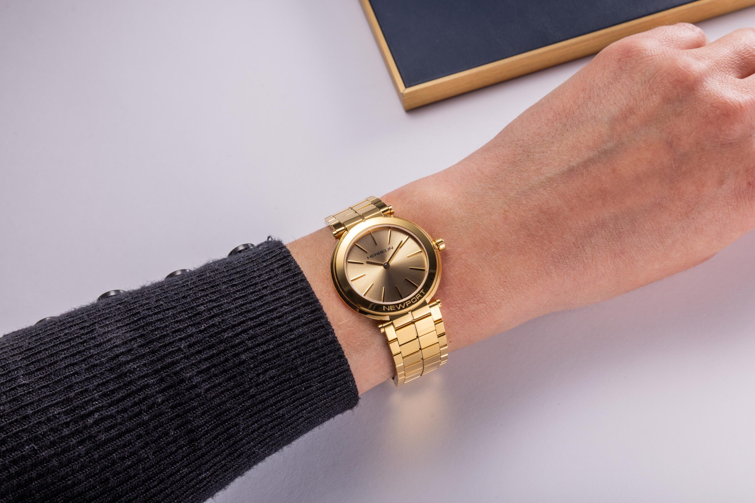 Das Zusammenspiel aus edlem Glanz und klarer Formensprache verleiht der goldfarbenen Uhr eine ausgesprochen elegante Ausstrahlung, die perfekt zum modernen Lifestyle passt. Das goldfarbene Zifferblatt mit zarten gleichfarbigen Indizes rundet das Gesamtbild stilvoll ab und macht die Uhr zu einem echten Hingucker am Handgelenk.
