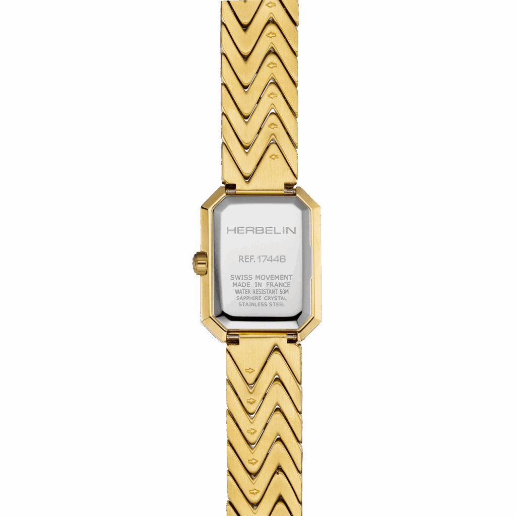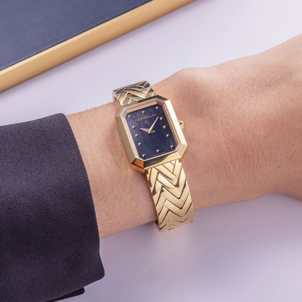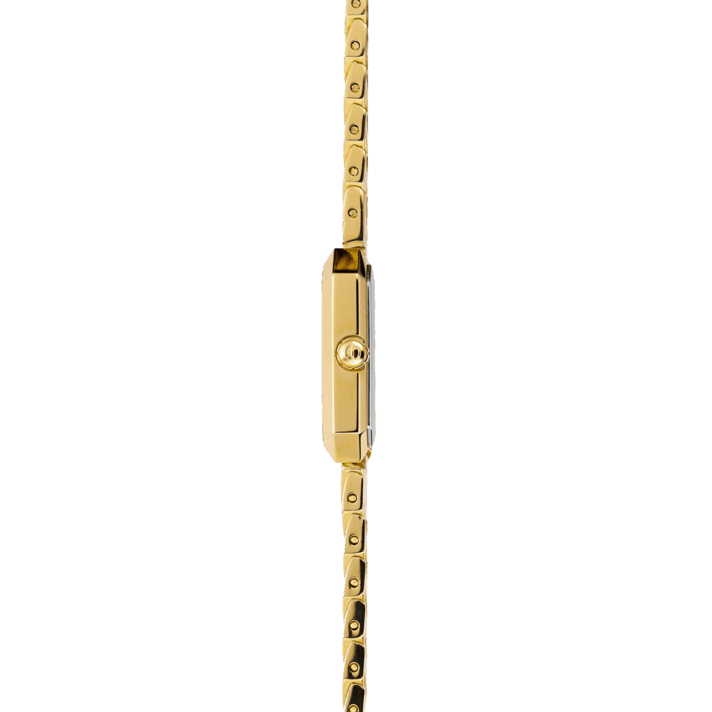 Die Uhr aus hochwertigem Edelstahl 316L ist mit einer PVD-Beschichtung in Gelbgold veredelt, die für ihren Glanz und ihre Beständigkeit geschätzt wird. Ein Saphirglas schützt das attraktive Zifferblatt aus dunklem Perlmutt, das der Uhr einen einzigartigen und besonders eleganten Stil verleiht.Die feminine Damenuhr mit ihrer schlanken Silhouette ist mit einer Faltschließe ausgestattet, die das An- und Ausziehen erleichtert und für einen sicheren Halt und Komfort am Handgelenk sorgt.