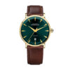 Das zeitlose Design wird von den zwei Uhrenzeigern in fein geschwungener Schwertform und einer klar strukturierten Minuterie, die wiederum von silberfarbenen Stundenindizes unterbrochen wird, konsequent fortgeführt. Ästhetische Details wie die mit schwarzem Onyxs ausgestattete Krone und das handgearbeitete mit Patina versehene Rindslederband unterstreichen die Eleganz des zeitlosen Designs dieses Zeitmesser auf besondere Weise.